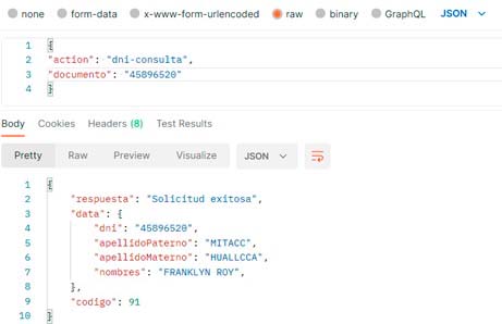 La respuesta de la consulta esta en formato JSON. La información utilizada para las consultas de DNI proviene del padrón reducido de la SUNAT.