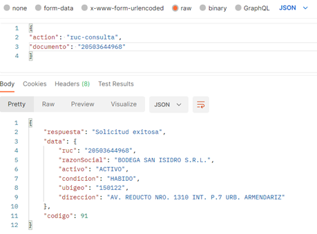 La respuesta de la consulta esta en formato JSON. La información utilizada para las consultas de RUC proviene del padrón reducido de la SUNAT.